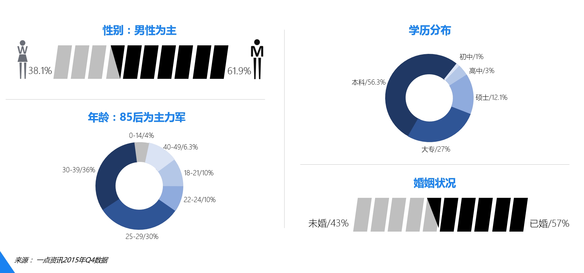 (3)年輕高端。一點(diǎn)資訊的用戶大部分集中在21-40歲之間,90后用戶群占據(jù)主導(dǎo),擁有潛在主流消費(fèi)群體,白領(lǐng)、高學(xué)歷、高收入人群居多。