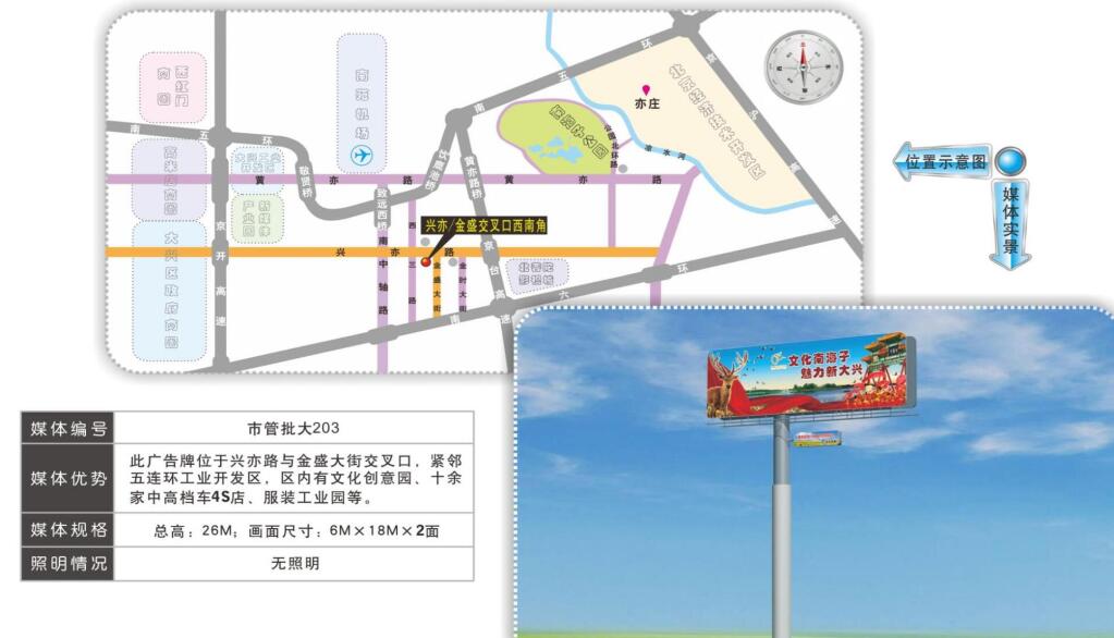 | 亦莊單立柱廣告 亦莊東區三面單立柱廣告 媒體位置: ?①亦莊經海一路與科創八街交界西北角、西南角 ②亦莊經海一路與科創十四街交界西北角、西南角 ③亦莊經海一路與科創十七街交界西北角 媒體規格:18m*6m*3面 ? ?? |