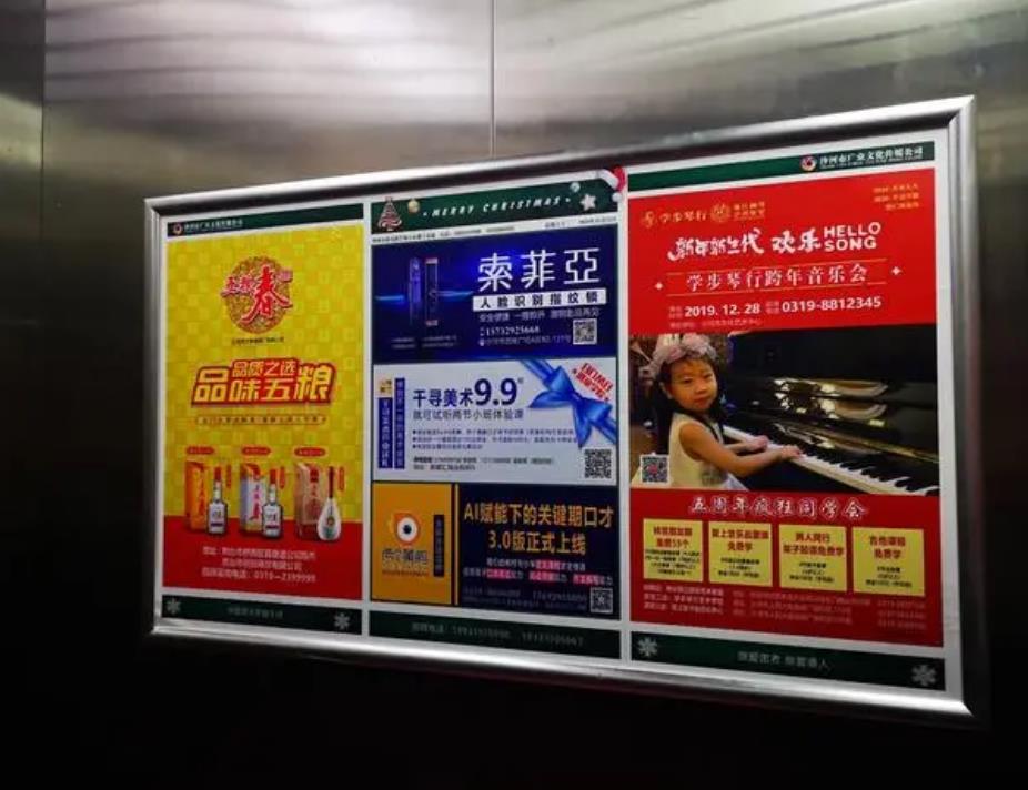 深圳電梯框架廣告是靜態廣告形式,由廣告框和海報組成,是電梯廣告中最常見的廣告形式,一般每個電梯轎廂可投放1-3塊電梯框架廣告,也有一些電梯框架廣告投放在電梯等候廳內。