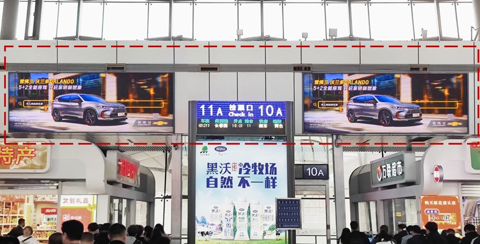 (1)覆蓋東西進站口人群 (2)進站口第一眼媒體; (3)進站候車區域面積最大的燈箱,位置高,極具氣勢; (4)LED旅客信息屏兩旁乘客必看媒體, 觸達率百分百。