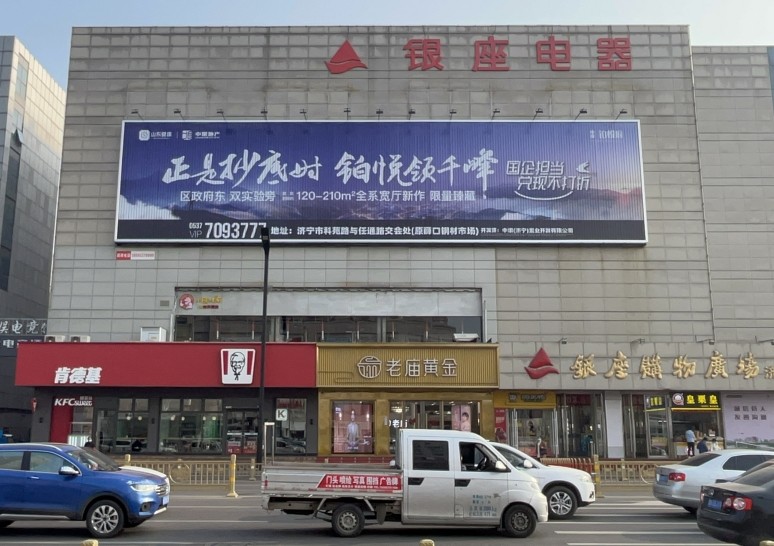大牌位于濟(jì)寧銀座購物廣場北立面墻體,無任何遮擋、視野開闊、展示面積大、效果震撼,極具廣告投放價(jià)值。