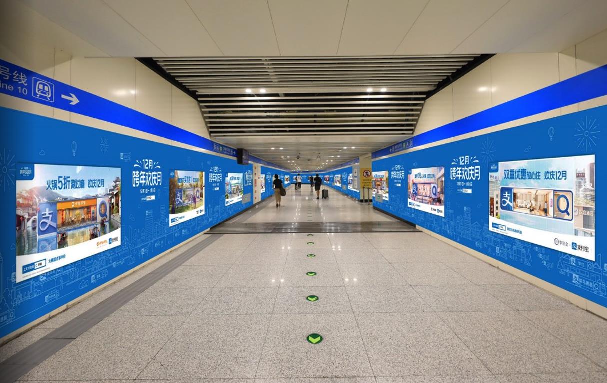 通道內(nèi)墻面呈弧形 ,雙側(cè)墻貼超大面積覆蓋,廣告的空間沉浸感強+可直面換乘通道內(nèi)的巨大客流,品牌推廣效果顯著