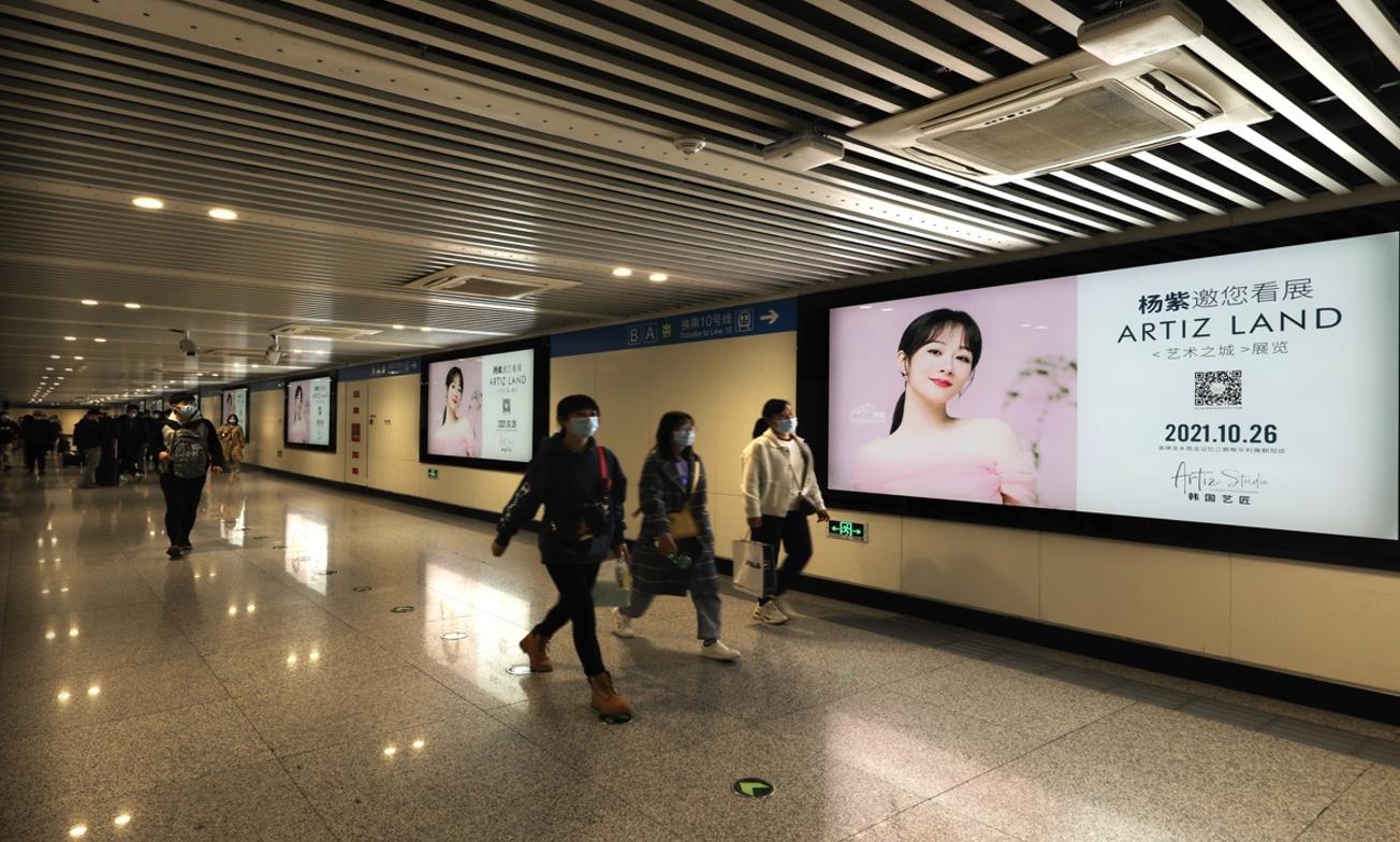 位于換乘通道入口 ,弧形墻面正對地鐵站廳,雙側(cè)超大墻貼直面乘客,利于產(chǎn)生直觀品牌印象,提升品牌認知度