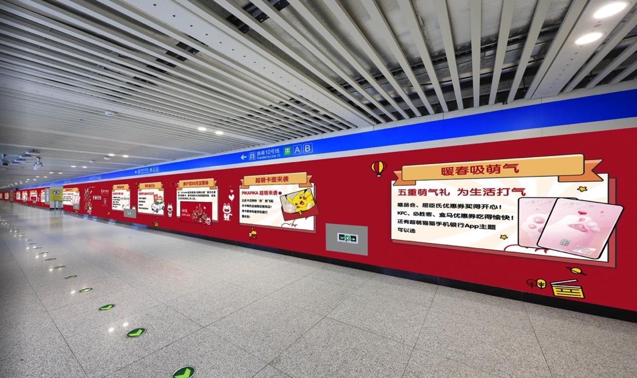 通道內(nèi)客流密集,超大幅面墻貼畫面伴隨乘客一路前行,廣告觸達時間長,有效保證品牌傳播