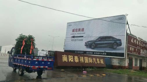 | 媒體形式 : 三面翻廣告牌 媒體規格 : 16mX8m=128㎡ 媒體說明 :該廣告位位于雪楓路迎賓大道北300米路東 泰祥汽車城大門口,三面翻大牌,可視面積大,可視距離遠,車流量:對面中商農批發市場是南陽最大的食品流通批發市場,老國道,汽車城內已入住開業10家4S店,下半年還有4家左右開業,35萬/天;人流量:30萬/天,可視距離遠,視覺沖擊力強,廣告效果絕佳。 |