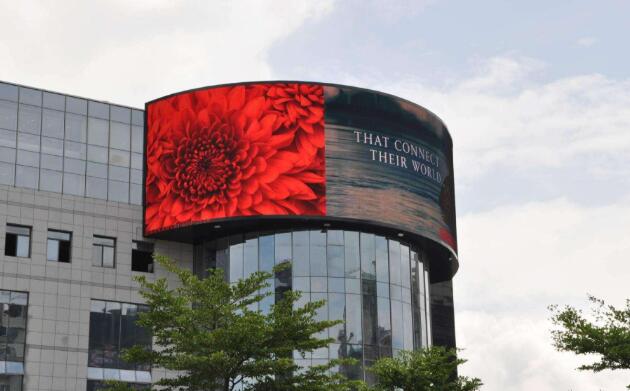 LED異型屏也開始運用至樓宇外墻LED廣告中。樓宇拐角處“LED曲面屏”的處理方式,可以擴大廣告的可視角度,兼顧到兩個方向的受眾視角。