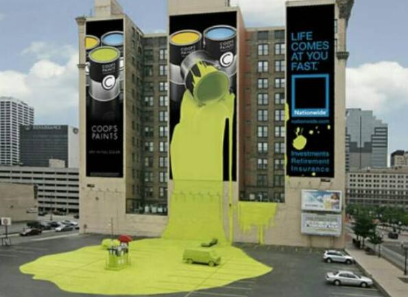 美國全國保險公司廣告采用的是戶外立體的大型廣告牌,從圖片中我們可以看出巨大的廣告牌里是不同顏色的油漆,有一桶油漆直接倒了下來,倒在地上,車上,到處都是。如此的廣告牌告訴我們,走在路上油漆桶都有可能倒下來,這種事情我們絕對提前預(yù)知不到,為了我們的生命安全,我們要多注意,更重要的是還是多買份保險,意外天天都有,災(zāi)難隨時回來,買份保險才是真道理。