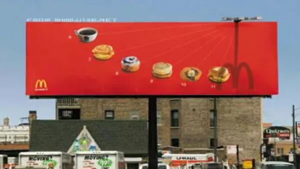 麥當勞是芝加哥的快餐一哥,在麥當勞打出的廣告里,最讓人有深刻印象的就是一個個性十足的大型時鐘廣告牌“日晷”,麥當勞在街道的一屋頂上設(shè)計了一個大型的時鐘,在12個小時刻鐘上分別放置了代表每一個時間點的麥當勞典型快餐,這樣的圖案效果,讓人在每一個時間都能想到麥當勞,廣告的宣傳效果非常突出。