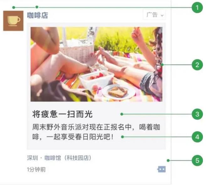 朋友圈圖文廣告由五或六個部分的內(nèi)容構(gòu)成,包含廣告主頭像&名稱、外層文案、外層圖片、文字鏈、用戶社交互動等, 本地推廣圖文廣告還包括門店標(biāo)。