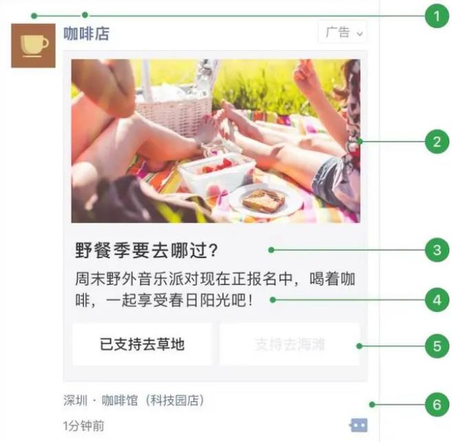 2. 外層圖片、小視頻;3. 外層文案標題(可選);4.外層文案詳情;5.門店標識(有線下門店可選擇展示);6.用戶社交互動。