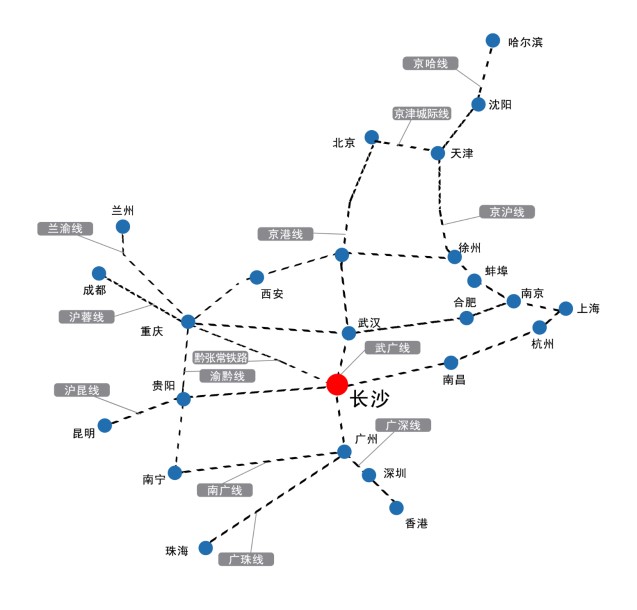 武廣高鐵,滬昆高鐵,建設(shè)中的渝長(zhǎng)廈高鐵,讓長(zhǎng)沙成為世界上唯一有多條高鐵交匯的城市。武廣、滬昆兩條高鐵大動(dòng)脈在此交匯,使得長(zhǎng)沙成為中部最大的全國(guó)性高鐵樞紐城市,也被稱(chēng)作為“離世界最近的地方”。