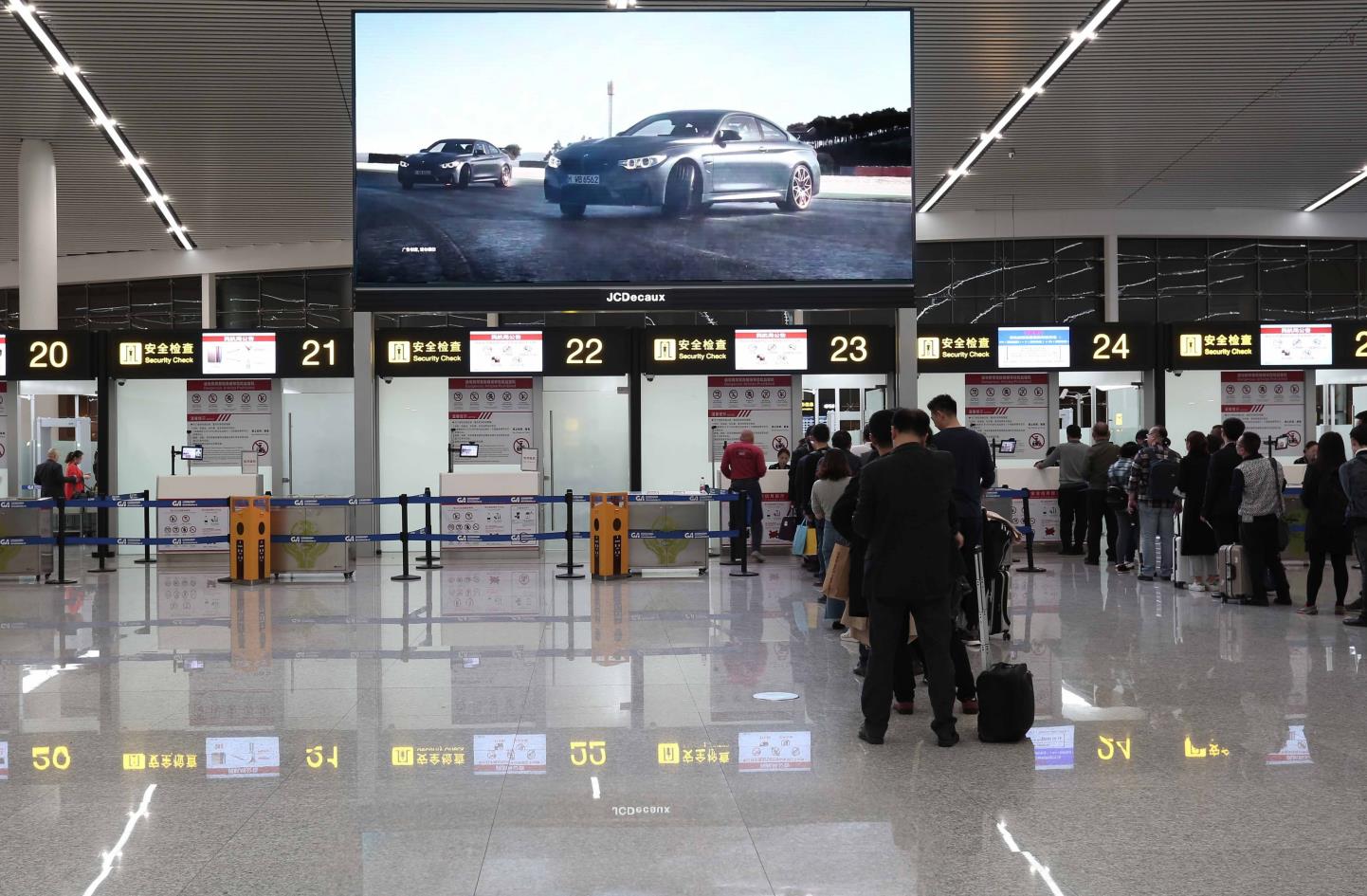 4個引人注目的大型LED屏幕架設在環境整潔的 安檢前區域;