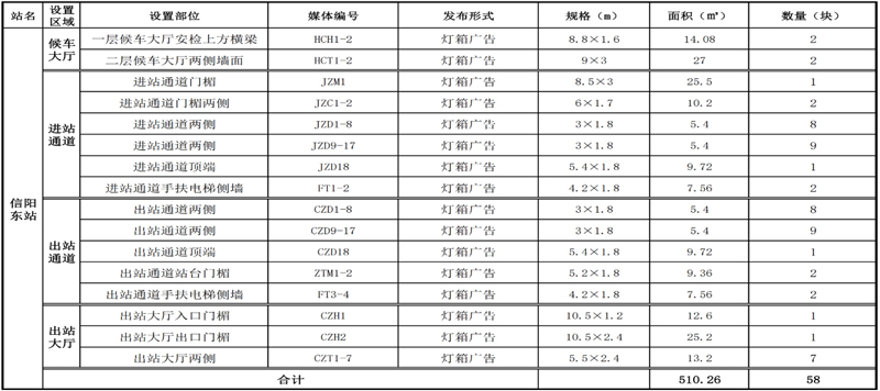 京廣高速鐵路重要組成部分,將信陽融入到鄭州和武漢1小時都市圈輻射范圍;信陽東站內(nèi)共有燈箱媒體58塊,媒體面積510.26㎡。