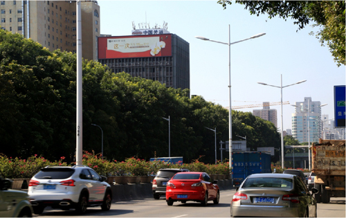 該廣告牌位于濱河路與皇崗路交匯處外運大廈西面墻體,濱河路是深圳車流密度最大的主干道之一,而皇崗路是連接市中心的交通要道,因此廣告牌垂直于路面,大氣美觀,處于十分顯眼的位置,可視距離非常遠,視覺效果十分突出,該廣告牌能覆蓋了羅湖,福田,南山往來的車輛及人群,受眾廣泛且層次高。