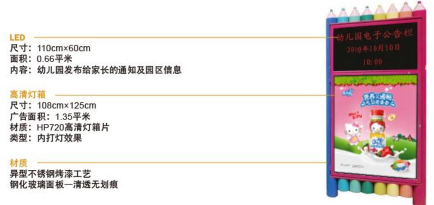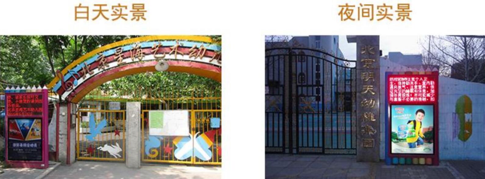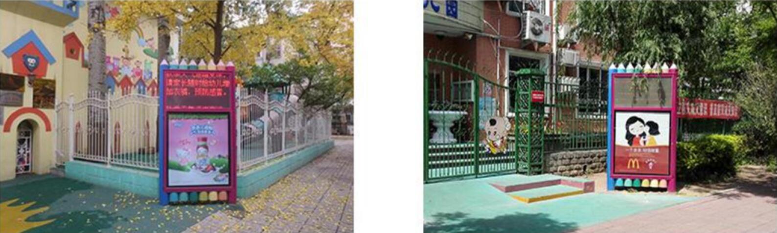| 幼兒園安放地方-幼兒園門口 駐足觀看:因家長接送孩子需要提早等候,一般提早15-30分鐘到場長時間觀看 反復觀看:因家長每天接、送一各次,每天接送至少2次到達幼兒園 必須觀看:LED信息是幼兒園傳達信息給家長的互動平臺,家長必須觀看 ![]() |