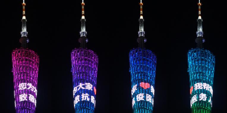 其中,除了有商家投入廣告費用購買廣告時段,讓自己的品牌出現在這個堪稱“廣州之巔”的廣告位上,市民和游客印象更深是每逢節日、重大事件、天氣狀況時,廣州塔塔身出現的各種暖心問候、溫馨提示和節慶祝福。新年、春節到來時,廣州塔塔身打出了“新年快樂”“Happy new year”的滾屏文字,向全城市民送上新年祝福;中秋、國慶等節日,又會出現充滿創意的慶祝節日圖案和祝福文字,增添節日氣氛;當遇到惡劣天氣時,廣州塔塔身又會出現天氣即使預報和“出門帶傘”、“注意保暖”的貼心照顧,就如身邊的親人噓寒問暖;在廣州舉辦《財富》全球論壇,廣州塔塔身也為盛事亮出主題圖案和閃亮文字,化身“宣傳大使”向世界發布這一重大盛事;廣州塔塔身廣告也助力廣州垃圾分類工作,每晚滾屏播放各種宣傳標語和倡議,在夜空中向全體市民和游客傳遞廣州花城的環保理念。