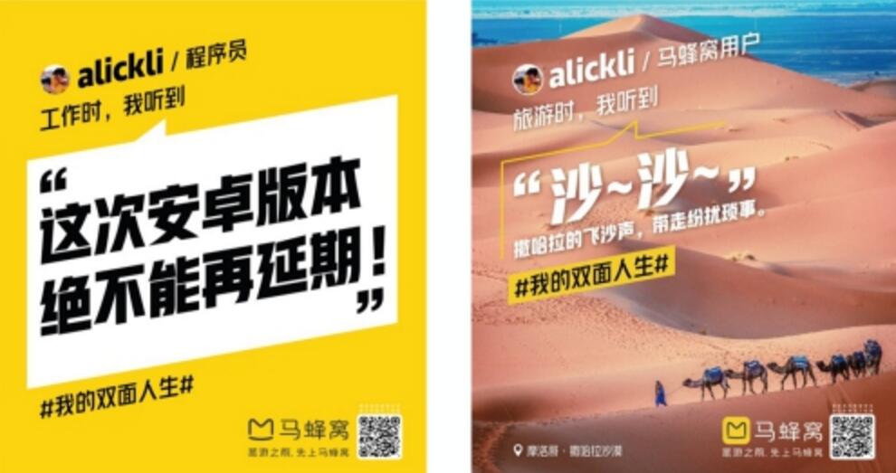 近日,北京地鐵1號(hào)線、2號(hào)線、10號(hào)線等十余條線路上,陸續(xù)出現(xiàn)了馬蜂窩旅游網(wǎng)的新版地鐵廣告。與近兩年常出現(xiàn)在人們視野中的標(biāo)志性品牌黃略有不同,這次廣告的主角是馬蜂窩的用戶們。廣告以“我的雙面人生”為主題,詮釋了當(dāng)代年輕人在工作中與旅途中展現(xiàn)出的不同自我,同時(shí)也體現(xiàn)出馬蜂窩作為一個(gè)年輕化旅游平臺(tái)的個(gè)性與多元。