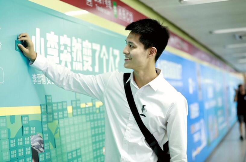 在地鐵通道廣告兩邊, 6張巨幅海報被銀行卡大小的卡片層層覆蓋,只在上方露出夸張的費解的文案:“小劉面臨重重誘惑?”、“小李突然變了個人?”、“小付突然驚聲尖叫”……對于來往人群來說,被遮住的畫面,懸念性的文案,讓人忍不住想“動手”親自揭牌翻出答案。在早高峰的換乘東單站,不少行色匆匆的上班族們在此停駐,或揭下覆蓋在海報上的卡片一探究竟,或在一旁圍觀謎底。短短半天內(nèi),6幅青春搶眼的“大玩卡”海報便被接力“解密”。