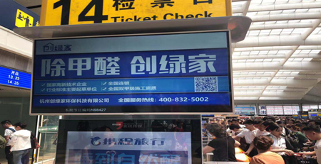 隨著高鐵優勢的凸顯,越來越多的人選擇乘坐高鐵出行。北京南站是北京面積最大、接發車次最多的火車站,每日客流量高達幾十萬人次。此次創綠家環保包攬了站內近百塊展示屏,連續24小時不間斷廣告展示,預計覆蓋人數達35萬人次之多,強大的視覺沖擊力,讓品牌魅力持續升溫。創綠家環保以這種近乎霸屏的北京南站高鐵廣告傳播形式,向人們傳達了環保健康的生活理念,同時也讓品牌形象更加深入人心!